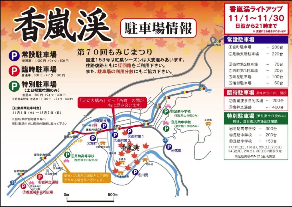 紅葉時期は臨時駐車場や特別駐車場などたくさんの駐車場が用意され、どこに停めればいいか悩んでしまいます。